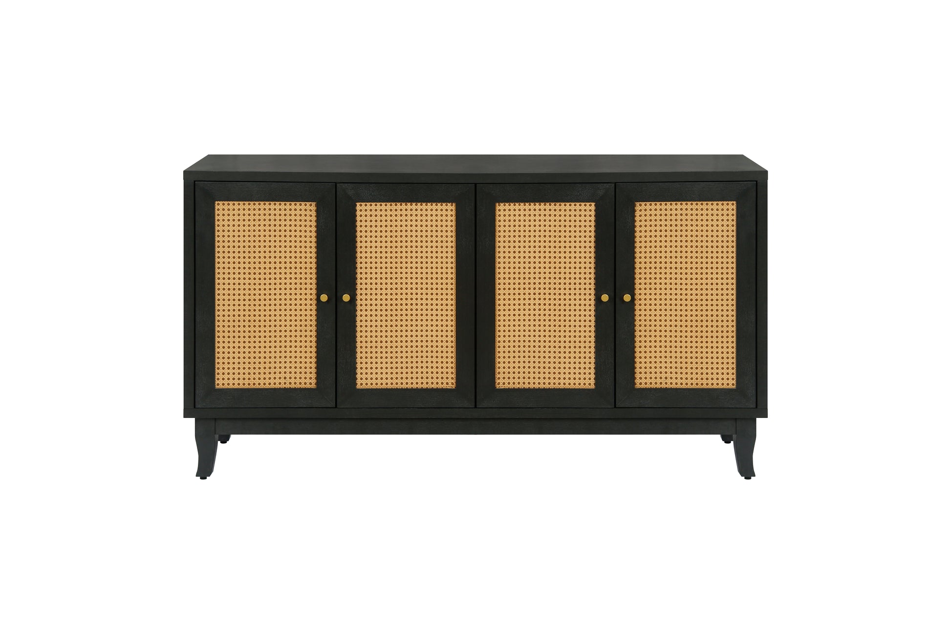 Handcrafted Premium Grain Panels Rattan Sideboard Buffer Cabinet Accent Storage Cabinet With 4 Rattan Doors BLACK
